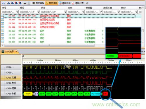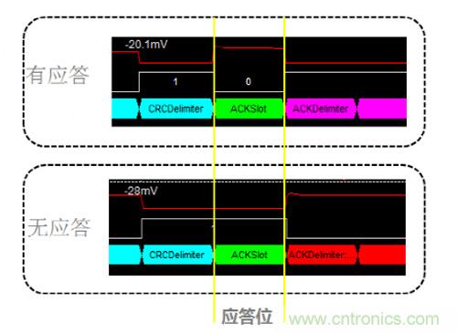 為什么會(huì)發(fā)生這種錯(cuò)誤呢?發(fā)送報(bào)文的節(jié)點(diǎn)會(huì)在ACK段發(fā)送兩個(gè)隱性位,若在第一個(gè)位期間接收到顯性電平則認(rèn)為該幀被正確接收。由于仲裁段相同時(shí)兩節(jié)點(diǎn)都認(rèn)為自己取得仲裁權(quán),在ACK段等待應(yīng)答,但該網(wǎng)絡(luò)中僅存在兩個(gè)節(jié)點(diǎn),因此在ACK段不能收到應(yīng)答,進(jìn)而發(fā)生應(yīng)答定界符錯(cuò)誤。簡(jiǎn)單說(shuō)來(lái)這種情形就類似于總線中只有一個(gè)節(jié)點(diǎn)將不能實(shí)現(xiàn)數(shù)據(jù)發(fā)送。圖7是在ACK段有無(wú)應(yīng)答時(shí)的波形對(duì)比。