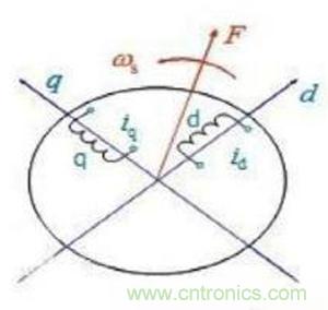 當(dāng)圖1和2的兩個旋轉(zhuǎn)磁動勢大小和轉(zhuǎn)速都相等時,即認(rèn)為圖2的兩相繞組與圖1的三相繞組等效。圖3兩個匝數(shù)相等且互相垂直的繞組d 和q,其中分別通以直流電流id和iq,產(chǎn)生合成磁動勢F,其位置相對于繞組來說是固定的。如果讓包含兩個繞組在內(nèi)的整個鐵心以同步 轉(zhuǎn)速旋轉(zhuǎn),則磁動勢F自然也隨之旋轉(zhuǎn)起來,成為旋轉(zhuǎn)磁動勢。把這個旋轉(zhuǎn)磁動勢的大小和轉(zhuǎn)速也控制成與圖1 和圖2中的磁動勢一樣,那么這套旋轉(zhuǎn)的直流繞組也就和前面兩套固定的交流繞組都等效了。