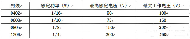 先來看看某廠家四種常用封裝電阻的參數(shù)表。其中表中有兩個(gè)值:額定工作電壓和最大工作電壓。
