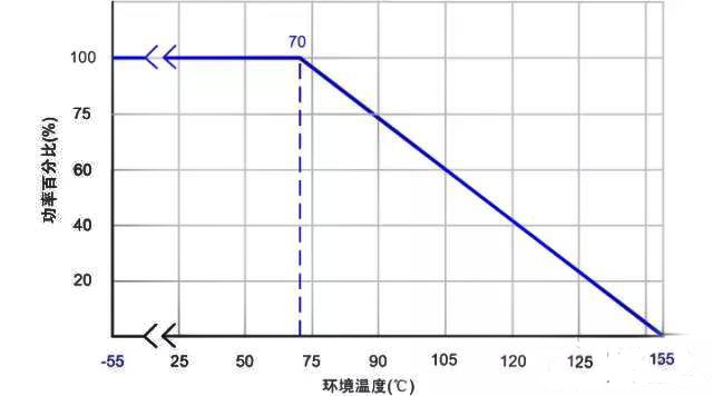 而最大工作電壓是在額定功率下,該電阻可以承受的最大電壓。但是要注意!看下面這個(gè)圖??梢钥闯鲱~定功率是在最高環(huán)境溫度70度的條件下標(biāo)注的(不同廠家,系列可能有微小區(qū)別,在設(shè)計(jì)之初和問題查找的時(shí)候應(yīng)該核實(shí)清楚。)