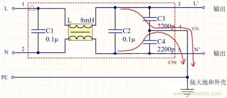 其中兩條紅線是火線和零線N的共模干擾電流回路,稱(chēng)為漏感電流回路。