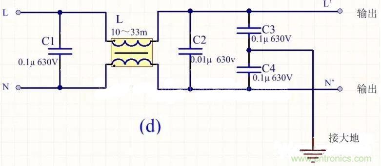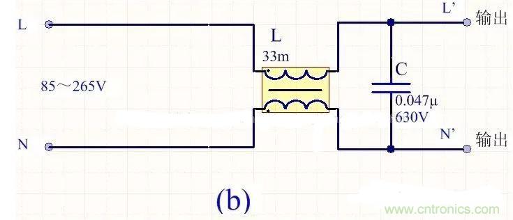 為降低成本和減小體積,開(kāi)關(guān)電源一般采用簡(jiǎn)易的EMI濾波器,主要包括共模扼流圈L和濾波電容,以下四種可以根據(jù)情況進(jìn)行選擇: