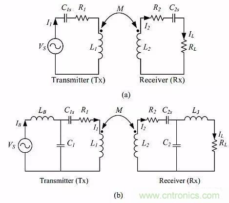 圖1:無線輸電(WPT)設(shè)計中所用補(bǔ)償電路拓?fù)溆兴姆N,這里是其中兩種:(a)SS拓?fù)?,(b)LCL-LCL拓?fù)洹?/p>
