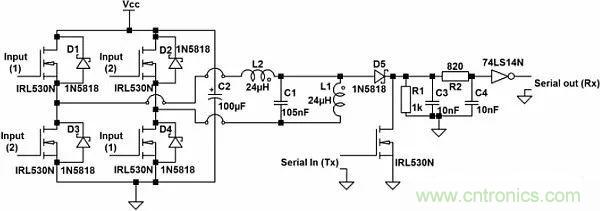 現(xiàn)在雙向輸電電路可以基于LCL逆變器來構(gòu)建,其中,兩個反相方波分別輸入到四MOSFET逆變器的1號和2號輸入端,見圖4。