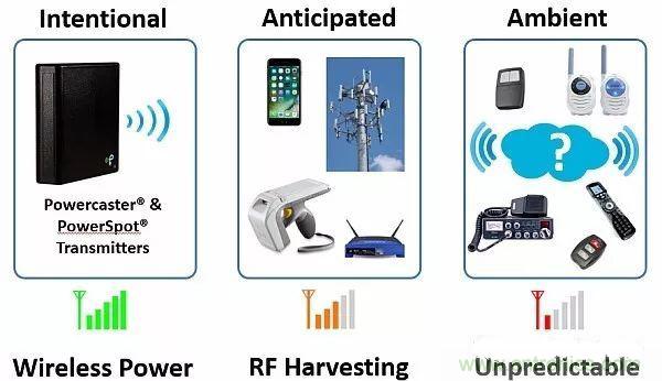 在壁櫥或梳妝臺抽屜中可以安裝類似手機(jī)發(fā)射器的小功率射頻發(fā)射器。這種發(fā)射器可以為可穿戴服裝提供充電區(qū)域。不管可穿戴設(shè)備是在壁櫥里還是在抽屜里,這些設(shè)備的電池都能自動接收涓流充電。這種方法與接收器需要依賴一定頻率范圍內(nèi)的隨機(jī)射頻信號的場景不相干。圖9給出了射頻電源種類。