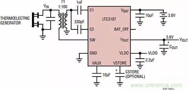 凌力爾特公司有一種基于LTC3107的能量采集解決方案,可用于給無線系統(tǒng)網(wǎng)絡(luò)和充電電池進(jìn)行供電,見圖16。