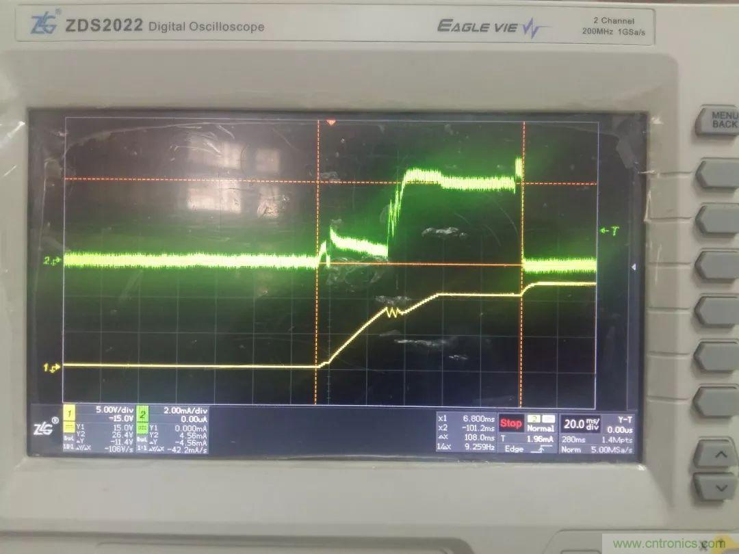 如下圖3所示,為圖2電路的實(shí)驗(yàn)波形圖,綠色為IE電流波形,黃色為VDD電壓波形(示波器采用zlgZDS2022)。從圖中可看出開(kāi)關(guān)電源啟動(dòng)可分三個(gè)階段,第一階段,在上電時(shí)IE以近似1mA的電流向電容C充電,當(dāng)VDD電壓達(dá)到UCC28C40門(mén)限電壓時(shí)進(jìn)入第二階段,此時(shí)飽和電流增加至5mA,在為IC供電的同時(shí)繼續(xù)為電容充電,當(dāng)輸出電壓建立后進(jìn)入第三階段,此時(shí)IE電流為零,啟動(dòng)電路停止工作,VDD電壓上升至輔助繞組電壓。在啟動(dòng)的整個(gè)過(guò)程中,IE的電流都是比較小而且比較平緩,所以該電路安全可靠。