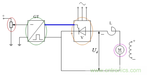 改變GT的輸入信號(hào)(圖2中的紅色圈顯現(xiàn))大小,就可改變其輸出脈沖(圖2中的藍(lán)色線條顯現(xiàn))的相位,不同相位的脈沖輸入整流器V,可以使整流器的輸出電壓Ud的大小發(fā)生變化,進(jìn)而改變電動(dòng)機(jī)M的轉(zhuǎn)速。