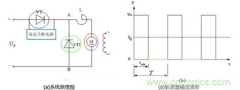 圖3中(a)圖為采用晶閘管做開關(guān)的直流斬波器—電動(dòng)機(jī)調(diào)速系統(tǒng)原理圖。
