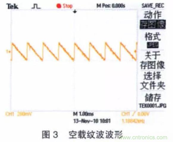 圖3 所示為空載時MAX606 輸出電壓紋波波形(Uo≈12 V),即開關(guān)紋波,其頻率為1.18 kHz,波形穩(wěn)定,Vpp=240 mV。圖4 所示為負(fù)載120 Ω 時輸出電壓的紋波波形,從圖4 中可以看出加入負(fù)載后電源紋波變得比較復(fù)雜,其最高Vpp達(dá)到1.2 V。為系統(tǒng)供電時,該紋波將會對系統(tǒng)造成嚴(yán)重危害,必須對此紋波進(jìn)行抑制。