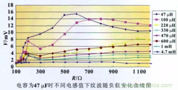 圖10 所示為在不同電容值(貼片鉭電解)下,改變電感和負(fù)載并測量負(fù)載上的電源紋波有效值所得出的曲線圖。