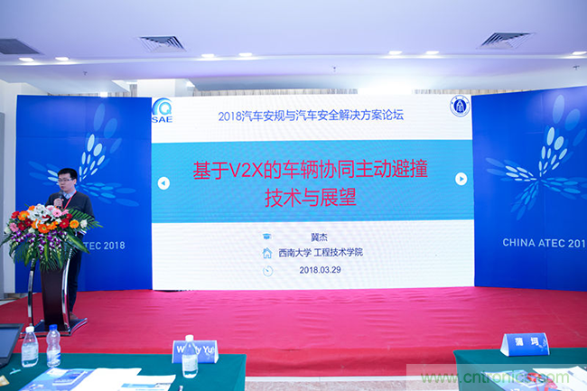 西南大學(xué)汽車電子專家冀杰博士在論壇上做了車規(guī)與基于V2X的車輛協(xié)同主動避撞技術(shù)展望的大會報(bào)告。