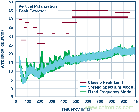 在整個(gè)負(fù)載范圍內(nèi),LT8645S可以輕松符合汽車CISPR25、Class 5峰值EMI限制。還可以使用擴(kuò)頻頻率調(diào)制進(jìn)一步降低EMI水平(圖2)。LT8645S內(nèi)置高效率頂部和底部功率開關(guān),并將必要的升壓二極管、振蕩器以及控制和邏輯電路集成到單個(gè)芯片中。低紋波突發(fā)工作模式可在低輸出電流下保持高效率,同時(shí)使輸出紋波低于10 mV p-p。最后,LT8645S采用小尺寸散熱增強(qiáng)型4 mm×6 mm、32引腳LQFN封裝。