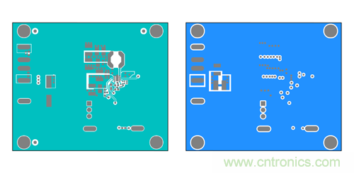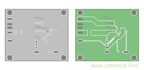 現(xiàn)在,我們以 Maxim 的喜馬拉雅 MAX17502 寬輸入范圍 IC 為例,器件工作在 4.5-60Vin、0.9- 54Vout,提供 1A 負載電流。以下為 MAX17502 EMI 評估板 PCB 的布局,采用了法拉第屏蔽技術 (b)。圖 11a 所示為頂層和底層,用作法拉第屏蔽;圖 11b 所示為內部第二層和第三層,用于布線。這里的第二層用作額外屏蔽,也可用于布線。該布局中,高 di/dt 電流環(huán)路 I1 和 I2 布置在第三層, 被完整籠罩在法拉第屏蔽中。