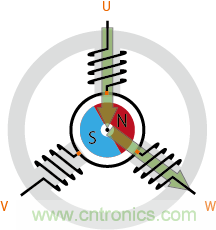 圖3:轉(zhuǎn)子的永久磁石會像被合成磁通量牽引一樣旋轉(zhuǎn),電機(jī)的軸也會因此旋轉(zhuǎn)