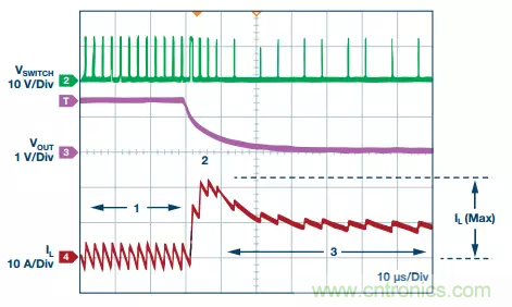 最初,峰值電感電流由選定的電感值、電源開關(guān)導(dǎo)通時(shí)間、電路的輸入和輸出電壓以及負(fù)載電流設(shè)置(圖中用“1”表示)。當(dāng)電路短路時(shí),電感電流迅速上升,直至達(dá)到限流點(diǎn),即 RS × IINDUCTOR (IL)等于最大電流檢測電壓,以保護(hù)器件和下游電路(圖中用“2”表示)。然后,內(nèi)置電流折返限制(圖中數(shù)字“3”)進(jìn)一步降低電感電流,以將熱應(yīng)力降至最低。