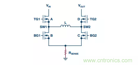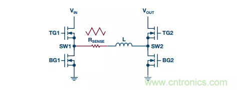 圖9電路解決了這個(gè)問題,其將檢測電阻與電感串聯(lián),從而在降壓和升壓模式下均能連續(xù)測量電感電流信號。由于電流檢測 RSENSE連接到具有高開關(guān)噪聲的SW1節(jié)點(diǎn),因此需要精心設(shè)計(jì)控制器IC,使內(nèi)部電流比較器有足夠長的消隱時(shí)間。
