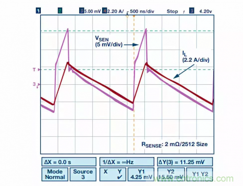 檢測電阻ESL的影響可能很輕微,也可能很嚴(yán)重。ESL會導(dǎo)致開關(guān)柵極驅(qū)動器發(fā)生明顯振蕩,從而對開關(guān)導(dǎo)通產(chǎn)生不利影響。它還會增加電流檢測信號的紋波,導(dǎo)致波形中出現(xiàn)電壓階躍,而不是預(yù)期的如圖13所示的鋸齒波形。這會降低電流檢測精度。