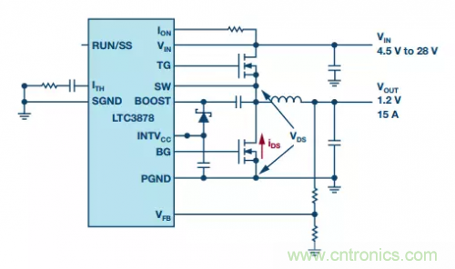 利用MOSFET RDS(ON)進(jìn)行電流檢測,可以實(shí)現(xiàn)簡單且經(jīng)濟(jì)高效的電流檢測。LTC3878是一款采用這種方法的器件。它使用恒定導(dǎo)通時(shí)間谷值模式電流檢測架構(gòu)。頂部開關(guān)導(dǎo)通固定的時(shí)間,此后底部開關(guān)導(dǎo)通,其RDS壓降用于檢測電流谷值或電流下限。