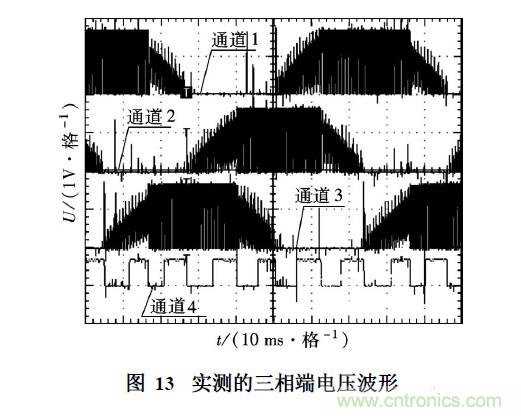 圖13為實(shí)測(cè)的三相端電壓波形(通道1~通道3) ,通道4的上升沿和下降沿分別對(duì)應(yīng)過(guò)零點(diǎn)和換相點(diǎn).