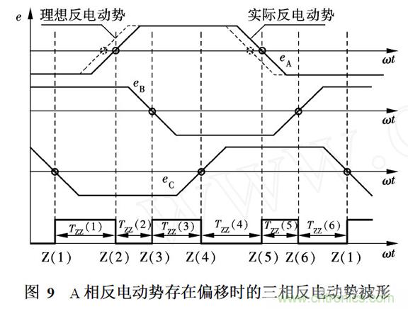 假設(shè)A 相反電動(dòng)勢(shì)存在相位偏移, 波形上升和下降部分上的過(guò)零點(diǎn)滯后出現(xiàn),導(dǎo)致過(guò)零點(diǎn)在時(shí)間軸上分布不均勻. 如圖9所示, 虛線表示理想反電動(dòng)勢(shì),實(shí)線表示存在相位偏移的實(shí)際反電動(dòng)勢(shì),過(guò)零點(diǎn)的間隔時(shí)間TZZ (1) , TZZ ( 2)和TZZ ( 3)不相等. 每相反電動(dòng)勢(shì)波形上升和下降部分的2個(gè)過(guò)零點(diǎn)相差180°電角度, 過(guò)零點(diǎn)間隔時(shí)間存在著周期性規(guī)律,如TZZ ( 1) =TZZ ( 4) , TZZ ( 2) = TZZ ( 5)和TZZ (3) = TZZ (6) .