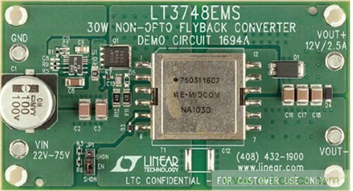 圖 3 示出了一款采用 LT3748 的演示電路板。該電路可接受一個(gè)范圍從 22V 至 75V 的 輸 入 電 壓, 并 在 高達(dá) 2.5A 的電流條件下產(chǎn)生一個(gè)隔離型12V 輸出。