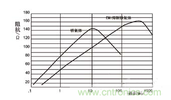 鐵氧體的效果隨著頻率的升高而增加。鐵氧體扼流圈的阻抗在10MHz處通常為幾十歐姆,當(dāng)頻率超過100MHz時,阻抗升高到數(shù)百歐姆(具體值取決于形狀和尺寸,鐵氧體體積越大,阻抗越大)。不同廠家的產(chǎn)品或同一廠家的不同種類的鐵氧體,其阻抗隨頻率的變化都有所不同。圖5是尺寸相同(外徑為5mm,長度為11mm)但材料不同的兩種鐵氧體的特性。