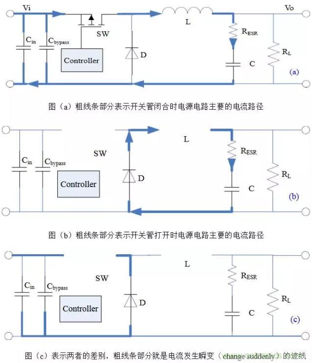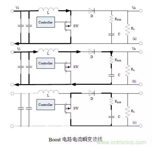 以Buck電路為例,不管開關(guān)管是由閉合-打開還是打開-閉合,電流發(fā)生瞬變的部分都如圖(c)所示,它們是會產(chǎn)生非常豐富的諧波分量的上升沿或下降沿。通俗的講,這些會產(chǎn)生瞬變的電流跡線(trace)就是所謂的“交流”(AC current),其余部分是“直流”(DC current)。當(dāng)然這里交直流的區(qū)別不是傳統(tǒng)教科書上的定義,而是指開關(guān)管的PWM頻率只是“交流”FFT變換里的一個分量,而在“直流”里這樣的諧波分量很低,可忽略不記。所以儲能電感屬于“直流”也就不奇怪,畢竟電感具有阻止電流發(fā)生瞬變的特性。因此,在開關(guān)電源布局時,“交流”跡線是最重要和最需要仔細(xì)考慮的地方。這也是需要牢記的唯一基本定律(only basic rule),并適用于其它法則和拓?fù)?。下圖表示了Boost電路電流瞬變跡線,注意它和Buck電路的區(qū)別。