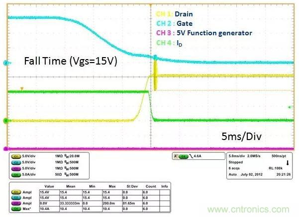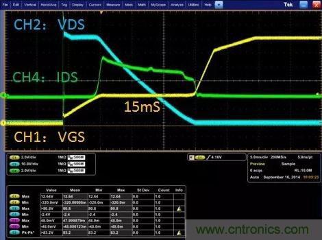 在電池保持板PCM過流關(guān)斷的過程中,從波形可以看到:功率MOSFET同樣也有較長的一段時(shí)間工作于線性區(qū)。