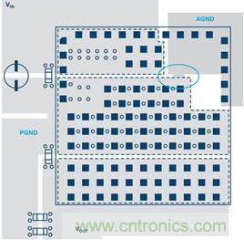 圖2:分開的AGND和PGND在接地標簽下方利用過孔連接。