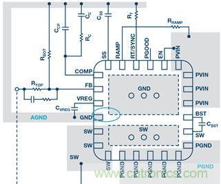 AGND 有時被稱為 SGND(信號接地層),是其他信號用作參照的接地連接,通常十分平靜。該接地層包括調(diào)節(jié)輸出電壓所需的內(nèi)部基準電壓。軟啟動和使能電壓也以 AGND 連接為參照。