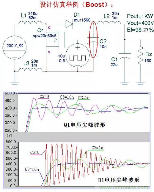 將開關管Q1、拓撲續(xù)流二極管D1和一個無損的拓撲電容C2組成一個在布線上盡可能簡短的吸收回路。