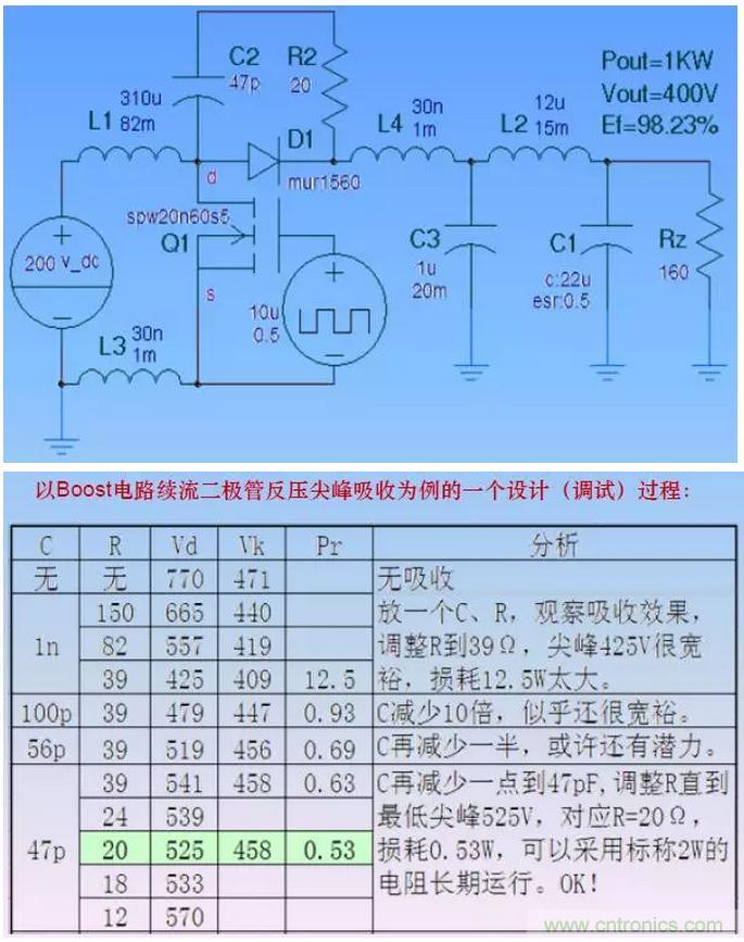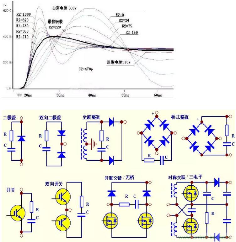 對應一個特定的吸收環(huán)境和一個特定大小的電容C,有一個最合適大小的電阻R,形成最大的阻尼、獲得最低的電壓尖峰。
