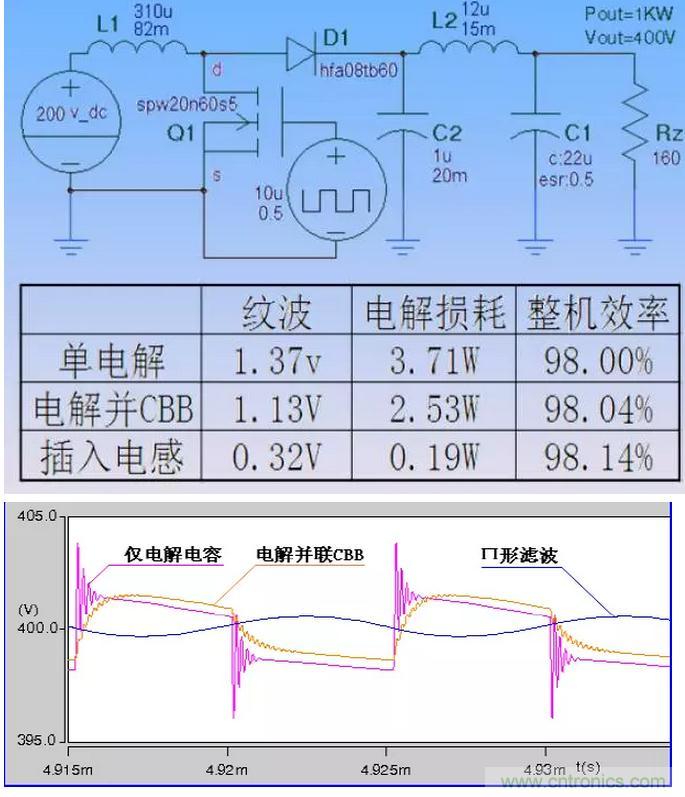 提出的辦法是:用電感將電解和CBB分開,CBB位于高頻紋波電流側,電解位于直流(工頻)側,各自承擔對應的濾波任務。