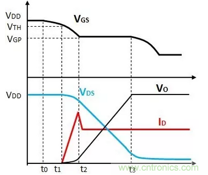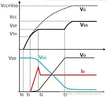 階段3(t2-t3)為米勒平臺,VGS電壓保持米勒平臺電壓VGP,整個過程中,VDS電壓逐漸下降到低的電壓值,ID電流保持不變。