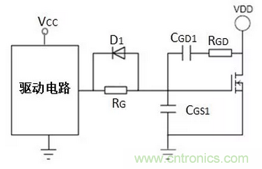 完整的外圍電路,包括G極電阻總和RG,RG并聯(lián)快關斷二極管D1,功率MOSFET的G、S外加電容CGS1,G、D外加電容CGD1和電阻RGD,如圖7所示,其中RG為G極電阻總和,包括功率MOSFET內部電阻、驅動芯片上拉電阻和外加串聯(lián)電阻RG1。