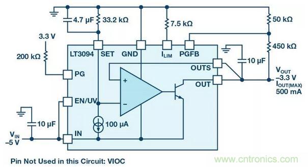 LT3094采用小尺寸、低成本的10μF陶瓷輸出電容工作,可優(yōu)化穩(wěn)定性和瞬態(tài)響應(yīng)。利用單個(gè)電阻器可編程外部精密電流限值(±10%過溫)。該器件的VIOC引腳可控制前端穩(wěn)壓器,以最大限度地降低功耗并優(yōu)化PSRR。單個(gè)SET引腳電容可降低輸出噪聲,并提供基準(zhǔn)軟啟動(dòng)功能,防止輸出電壓在開啟時(shí)過沖。此外,該器件的內(nèi)部保護(hù)電路還包括具有折返功能的內(nèi)部限流和帶遲滯的熱過載。其他功能包括快速啟動(dòng)功能(如果使用的SET引腳電容值較大,則非常有用)和電源良好標(biāo)志(業(yè)界首款具有此功能的負(fù)輸出LDO穩(wěn)壓器),具有可編程閾值,用于指示輸出電壓調(diào)節(jié)。