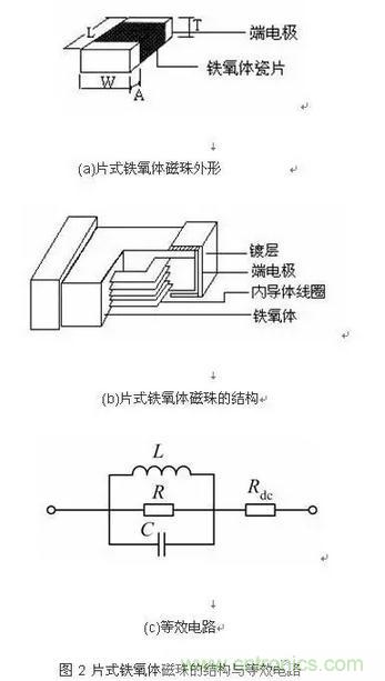 片式磁珠是目前應(yīng)用、發(fā)展很快的一種抗干擾元件,廉價(jià)、易用,濾除高頻噪聲效果顯著。片式磁珠由軟磁鐵氧體材料組成,片式鐵氧體磁珠的結(jié)構(gòu)和等效電路如圖2所示,實(shí)質(zhì)上它就是1個(gè)疊層型片式電感器,是由鐵氧體磁性材料與導(dǎo)體線圈組成的疊層型獨(dú)石結(jié)構(gòu)。由于在高溫下燒結(jié)而成,因而具有致密性好、可靠性高等優(yōu)點(diǎn)。兩端的電極由銀/鎳/焊錫3層構(gòu)成,可滿足再流焊和波峰焊的要求。在圖2所示的等效電路中,R代表由于鐵氧體材料的損耗(主要是磁損耗)以及導(dǎo)體線圈的歐盟損耗而引起的等效電阻,C是導(dǎo)體線圈的寄生電容。