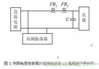 由于鐵氧體磁珠在電路中使用能夠增加高頻損耗而又不引入直流損耗,而且體積小、便于安裝在區(qū)間的引線或者導(dǎo)線上,對(duì)于1MHz以上的噪聲信號(hào)抑制效果十分明顯,因此可用作高頻電路的去耦、濾波以及寄生振蕩的抑制等。特別對(duì)消除電路內(nèi)部由開關(guān)器件引起的電流突變和濾波電源線或其它導(dǎo)線引入電路的高頻噪聲干擾效果明顯。低阻抗的供電回路、諧振電路、丙類功率放大器以及可控硅開關(guān)電路等,使用鐵氧體磁珠進(jìn)行濾波都是十分有效的。鐵氧體磁珠一般可以分為電阻性和電感性兩類,使用時(shí)可以根據(jù)需要選取。單個(gè)磁珠的阻抗一般為十至幾百歐姆,應(yīng)用時(shí)如果一個(gè)衰減量不夠時(shí)可以用多個(gè)磁珠串聯(lián)使用,但是通常三個(gè)以上時(shí)效果就不會(huì)再明顯增加了[7]。如圖3示出了利用兩只電感性鐵氧體磁珠構(gòu)成的高頻LC濾波器電路,該電路可有效的吸收由高頻振蕩器產(chǎn)生的振蕩信號(hào)而不致竄入負(fù)載,并且不降低負(fù)載上的直流電壓。