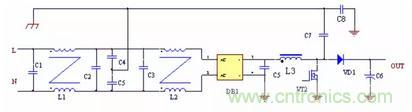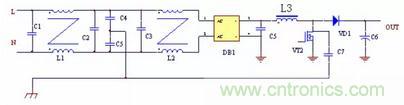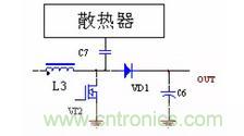圖中C2 是二極管VD1 和VD2 與散熱器之間的耦合電容,容量一般在幾十PF,C3 是增加的電容,C3 要遠大于C2,DC/DC 整流管、續(xù)流管上的電壓峰值經(jīng)過C2 與C3 的分壓,幅度大大降低,就可以大大減小向外的輻射。