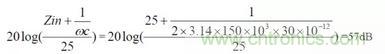 傳導(dǎo)發(fā)射測試設(shè)備內(nèi)部的去耦網(wǎng)絡(luò)(LISN)內(nèi)阻Zin 標準為50Ω。則耦合電容C7 與測試設(shè)備去耦網(wǎng)絡(luò)的內(nèi)阻Zin 對騷擾電平的衰減為: