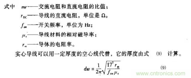 電阻損耗是變壓器或電感內(nèi)部繞組的電阻產(chǎn)生的損耗。有兩種形式的電阻損耗:直流電阻損耗和集膚效應(yīng)電阻損耗。直流電阻損耗由繞組導(dǎo)線的電阻與流過(guò)的電流有效值二次方的乘積所決定。集膚效應(yīng)是由于在導(dǎo)線內(nèi)強(qiáng)交流電磁場(chǎng)作用下,導(dǎo)線中心的電流被“推向”導(dǎo)線表面而使導(dǎo)線的電阻實(shí)際增加所致,電流在更小的截面中流動(dòng)使導(dǎo)線的有效直徑顯得小了。式(8)給出了這兩個(gè)損耗在一個(gè)表達(dá)式中的計(jì)算式。