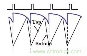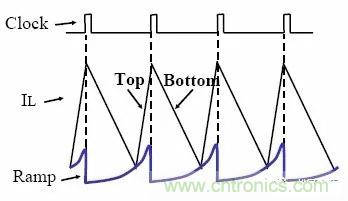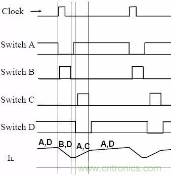 當(dāng)輸入電壓比輸出電壓高△V時,開關(guān)管D保持常開,開關(guān)管C保持常關(guān),開關(guān)管A和B工作于同步的Buck模式。其工作原理與一般的同步的Buck工作原理完全相同,控制的方法為谷點(diǎn)電流模式,如圖2所示,其中D為占空比。