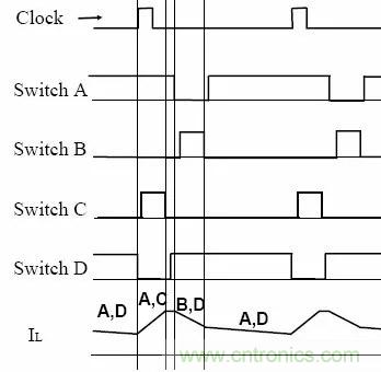 當(dāng)輸入電壓比輸出電壓低△V時,開關(guān)管A保持常開,開關(guān)管B保持常關(guān),開關(guān)管C和D工作于同步Boost模式。其工作原理與一般的同步Boost工作原理完全相同,控制的方法為峰值電流模式,如圖5所示。
