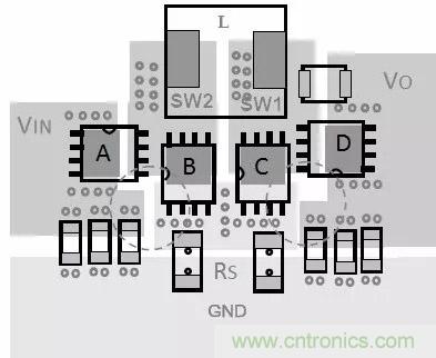 降壓Buck變換器的電感位于輸出回路,所以輸出回路的電流是連續(xù)的,輸入回路的電流是不連續(xù)的,輸入回路的干擾大,這些環(huán)路產(chǎn)生很大的磁場發(fā)射,因此輸入回路要盡可能的小。輸入回路的地為功率地,要與系統(tǒng)的信號地分開單獨(dú)布線,輸出地可以作為干凈的信號地。