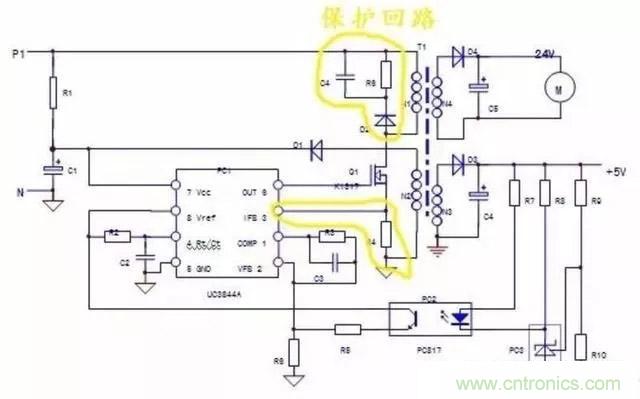 3)保護回路:PC1芯片本身和3腳外圍元件R4構(gòu)成過電流保護回路;N1繞組上并聯(lián)的D2,R6,C4元件構(gòu)成了開關(guān)管的反壓吸收保護電路;實質(zhì)上穩(wěn)壓回路的電壓反饋信號——穩(wěn)壓信號,也可看作一路電壓保護信號,但保護電路的內(nèi)容并不僅是局限于保護電路本身,保護電路的啟控往往是由于負(fù)載電路異常所引起的。