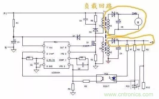 4)負(fù)載回路:N3,N4二次繞組及后續(xù)電路,均為負(fù)載回路,負(fù)載回路的異常,會牽涉到保護回路和穩(wěn)壓回路,使兩個回路做出相應(yīng)的保護和調(diào)整動作。