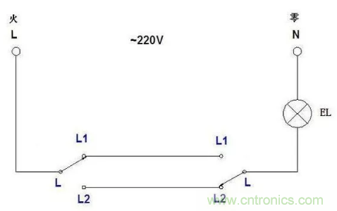 大家看這個(gè)接法,兩個(gè)單聯(lián)雙控的L1連一起接燈的控制線,兩個(gè)L2連一起接的是火線,燈接零線。這種接法也是很安全的,唯一的缺點(diǎn)就是費(fèi)線。