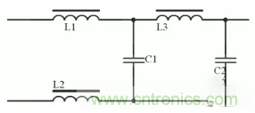圖5是開(kāi)關(guān)電源的直流輸出側(cè)濾波電路,它由共模扼流圈L1、L2,扼流圈L3和電容C1、C2組成。為了防止磁芯在較大的磁場(chǎng)強(qiáng)度下飽和而使扼流圈失去作用,磁芯必須采用高頻特性好且飽和磁場(chǎng)強(qiáng)度大的恒μ磁芯。