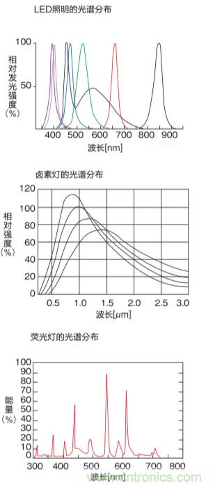 當然就算你的響應(yīng)速度再快、消耗電流更小、壽命更長但如果光譜分布不好也是有問題的,所以下面我們看一下LED的顏色光譜分布情況。首先要說明LED照明的光譜分布不像熒光燈、鹵素燈那樣波長分布較寬,每個LED照明發(fā)光波長可謂某個固定的特定波長。